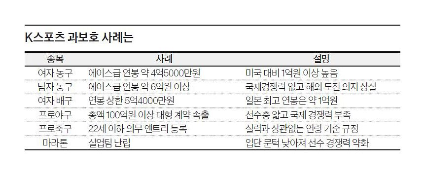 여자 농구와 배구는 더 심각하다. 2025년 기준, 한국 여자 농구 에이스의 연봉은 4억5000만원 선으로 세계 최고 무대인 미국여자프로농구(WNBA) 최고 연봉(약 3억5000만원)보다 많다. 여자 배구 연봉 상한은 5억4000만원으로 일본 여자 배구 최고 연봉(약 1억원)의 다섯 배가 넘는다.