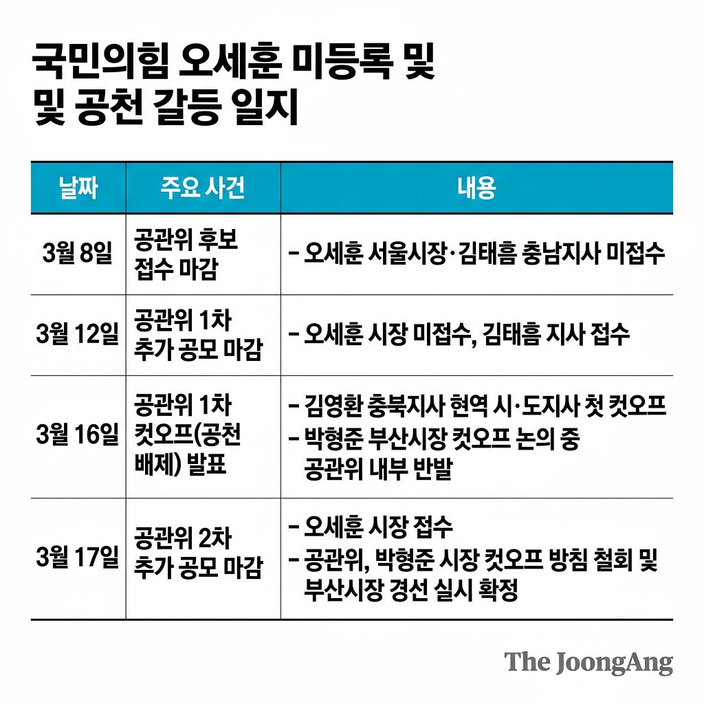 그럼에도 출마로 선회한 배경에 대해 오 시장 측은 “6·3 지방선거가 목전인 상황을 고려해 후보 등록 뒤 장 대표의 잘못된 점을 지적하며 당의 변화를 이끌어 가겠다는 것”이라고 밝혔다. 오 시장도 이날 “비상대책위원회에 버금가는 혁신 선대위를 반드시 관철하겠다”고 했다. 사실상 장 대표의 2선 후퇴를 거듭 요구한 것이다. 오 시장은 기자회견 뒤 기자들과 만난 자리에선 “기울어진 운동장의 각도를 조금이라도 줄이기 위해 노력했는데 당에 의해 매몰차게 거절당했다”며 “더 열심히 뛰는 수밖에 없다”고 했다.