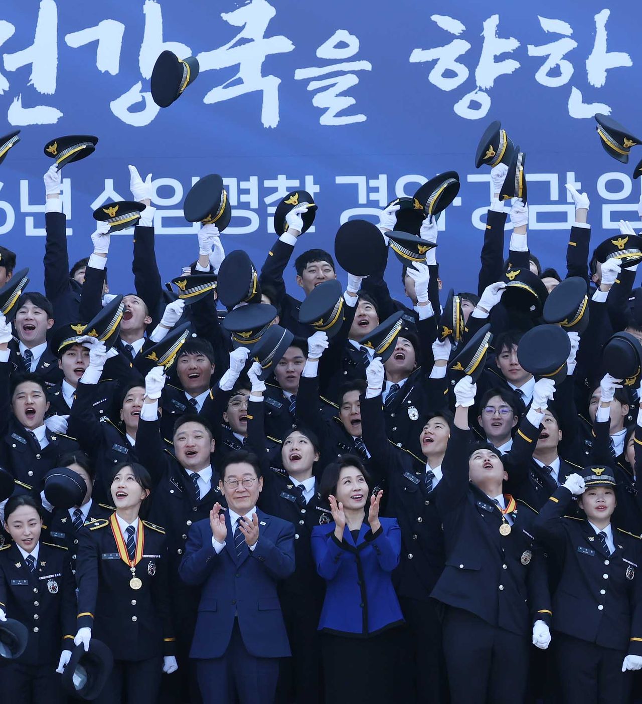 이재명 대통령과 김혜경 여사가 17일 충남 아산 경찰대학교에서 열린 신임 경찰 경위·경감 임용식에서 참석자들과 기념촬영을 하고 있다. 이 대통령은 이 자리에서 “오직 국민을 위해서만 헌신하는 ‘국민의 경찰’이 되어 달라”고 당부했다. [청와대사진기자단]