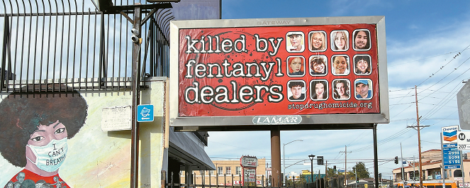 사우스 LA 지역 한 빌보드에 펜타닐 남용으로 숨진 이들의 얼굴 사진이 걸려 있다. LA카운티 공공보건국에 따르면 지난해 카운티 전체 약물 과다복용 사망 가운데 52%가 펜타닐과 관련된 것으로 집계됐다. 김상진 기자