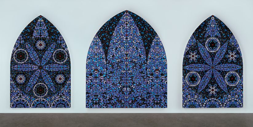 8601개의 다이아몬드로 뒤덮은 두개골, 포름알데히드에 통째로 절인 상어, 파리떼 꼬인 소머리에 비하면 수천 마리의 나비 날개 표본을 중세 성당의 스테인드글라스처럼 붙인 ‘신의 무한한 권능과 영광을 묵상하며’(2008)는 얌전한 편이다.