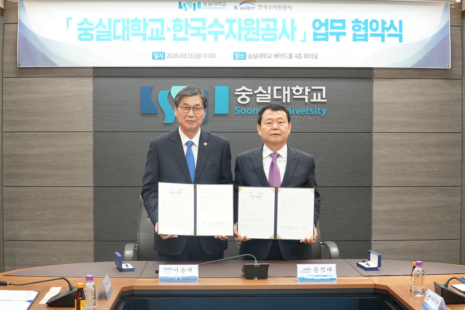 숭실대학교(총장 이윤재)는 3월 13일 베어드홀 4층 회의실에서 한국수자원공사(K-water, 사장 윤석대)와 ‘기후에너지 전문 인력 양성을 위한 상호협력 교육협약(MOU)’을 체결했다고 밝혔다.