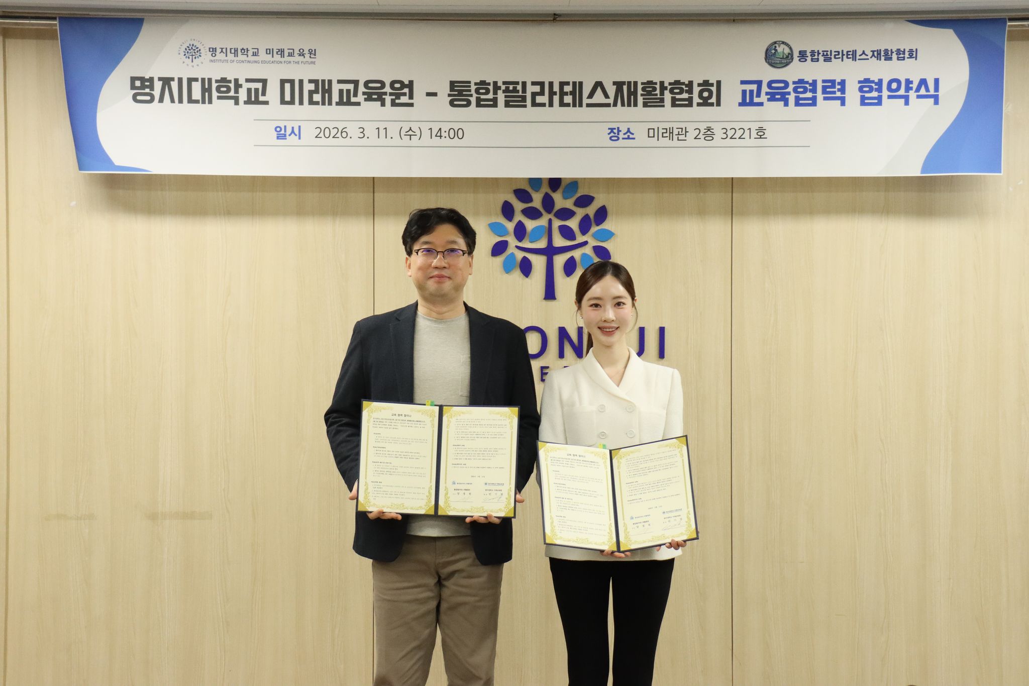 명지대학교(총장 임연수) 인문미래교육원(원장 빈기범)은 지난 11일 인문캠퍼스 미래관 세미나실에서 통합필라테스재활협회(협회장 양정원)와 업무협약(MOU)을 체결하고, 여성 건강관리 분야 전문 인력 양성을 위한 ‘산전·산후 필라테스 전문가 과정’을 공동 운영하기로 했다.