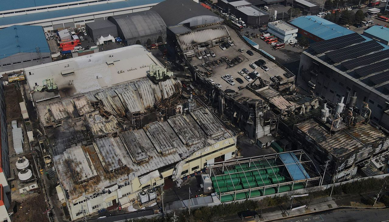 지난 20일 오후 대전시 대덕구 자동차·선박 부품 제조 공장 안전공업㈜에서 발생한 화재로 14명이 숨지는 등 74명의 사상자가 발생했다. 사망자가 집중적으로 발견된 휴게실은 건축 허가 당시 제출된 도면에 없던 공간으로 확인됐다. 경찰은 131명 규모의 전담팀을 편성해 화재 원인 등을 조사하고 있다. 사진은 지난 21일 상공에서 내려다본 화재 현장. [뉴스1]