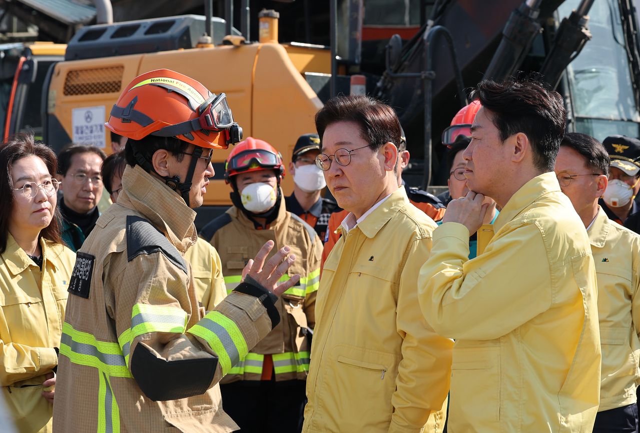 이재명 대통령이 지난 21일 오후 대전시 대덕구 안전공업 화재 현장을 방문해 피해 상황을 보고받고 있다. 이 대통령은 이날 자신의 SNS에 “정부는 이번 사고의 원인과 경위를 철저히 규명할 것”이라고 밝혔다.