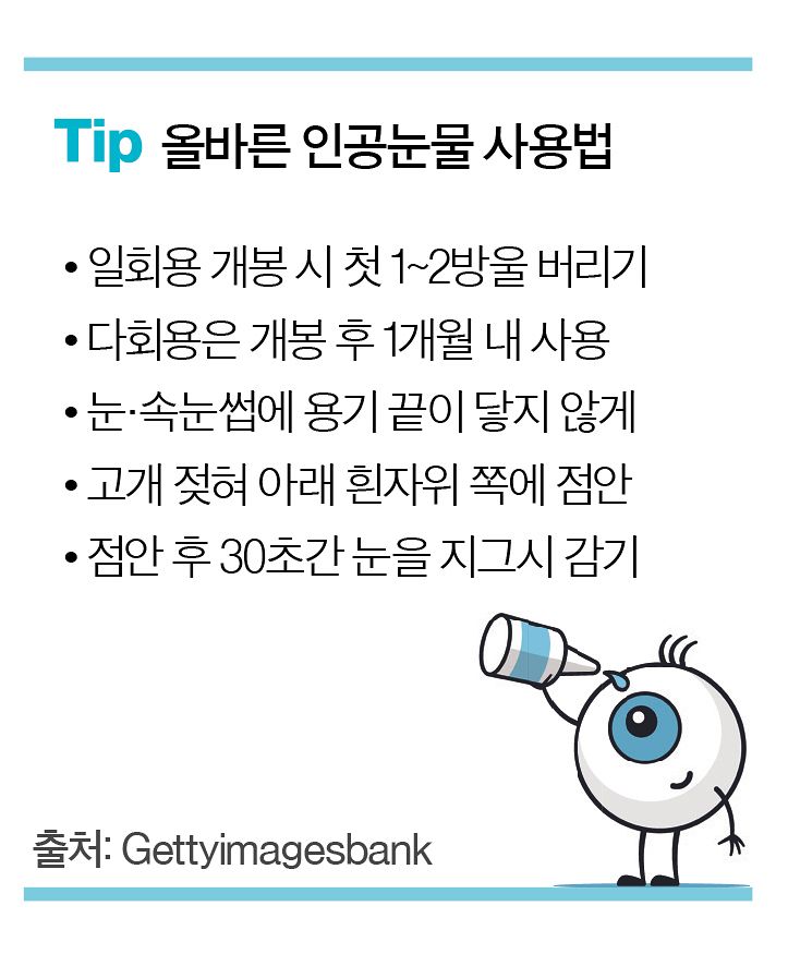 ‘자주 넣으면 내성이 생길까?’ 인공눈물을 쓰는 이들이라면 한번쯤 가져봤을 궁금증이다. 고 전문의는 “보존제가 없는 일회용 제품은 1~2시간 간격으로 점안해도 안전하다”며 내성 우려를 일축했다. 단, 보존제가 든 다회용 제품은 주의할 것을 당부했다. 보존제로 흔히 쓰이는 벤잘코늄염화물은 장기 사용 시 독성 각결막염을 유발할 수 있어서다. 따라서 다회용 제품은 하루 6회 이내로 사용을 제한하고, 그보다 자주 점안해야 한다면 일회용 무보존제 제품을 선택하는 것이 좋다. 렌즈를 꼈을 때도 무보존제 제품을 써야 한다. 벤잘코늄염화물이 렌즈에 흡착돼 각막을 자극하거나 렌즈를 변색·변형시킬 수 있다.