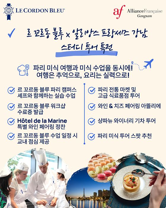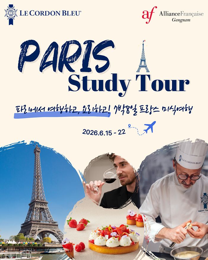 르 꼬르동 블루 한국지사와 프랑스 전문 어학원 알리앙스 프랑세즈 강남이 직접 주최하는 이번 스터디 투어는 오는 6월 15일부터 7박 8일 일정으로 진행된다.