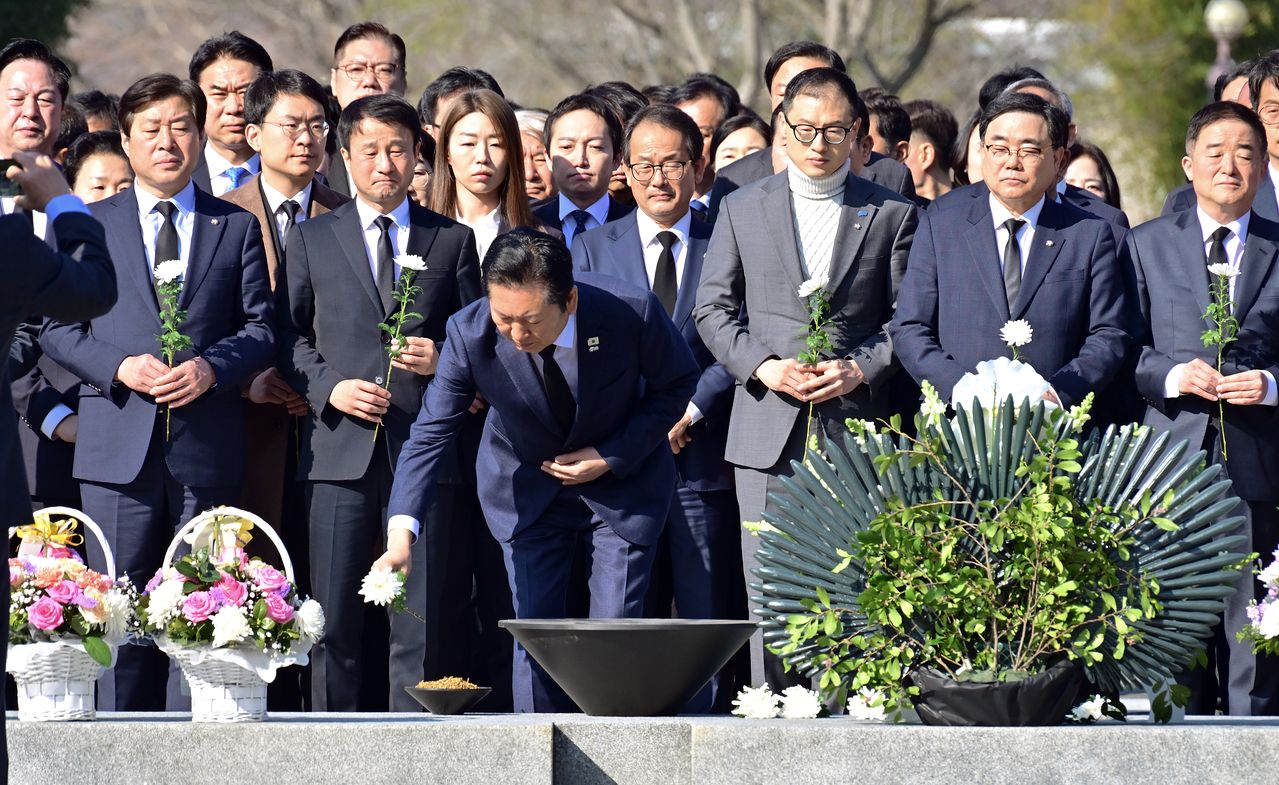 정청래 더불어민주당 대표(가운데)가 23일 경남 김해시 진영읍 봉하마을 고 노무현 전 대통령 묘역에 헌화하고 있다. 정 대표는 이날 “대통령님께 보고드린다. 검찰청은 이제 역사 속으로 사라지게 됐다”고 말했다.