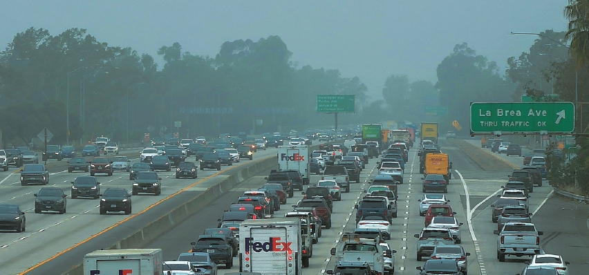 23일 오전 LA 10번 프리웨이 라브레아 애비뉴 인근에 짙은 안개가 끼어 차량들이 서행하고 있다. 바다에서 유입된 차고 습한 공기 영향으로 오전에 안개가 자주 발생할 수 있어 운전자의 주의가 요구된다.