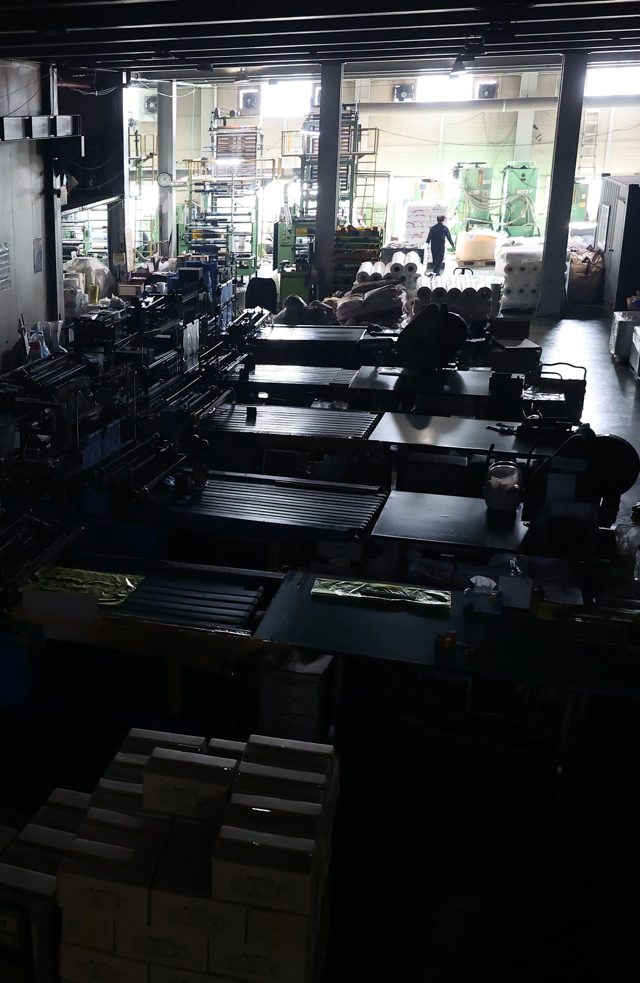 중동전쟁으로 비닐과 플라스틱 원료인 나프타 수급에 비상이 걸리면서 24일 경기도 안산시의 종량제 봉투 등 비닐봉지 제조공장 작업대의 불이 꺼져 있다. ‘비닐·플라스틱 제품 대란’ 우려가 확산하자 일부 영세업자와 시민들 사이에서는 사재기 현상까지 나타나고 있다. [연합뉴스]
