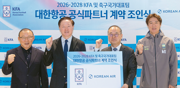 대한항공은 지난 23일 인천국제공항 제2 여객터미널에서 대한축구협회(KFA)와 공식 후원 및 파트너 조인식을 열었다고 밝혔다. 이번 계약에 따라 대한항공은 향후 2년간 한국 축구 국가대표팀의 항공권을 지원하고 KFA의 공식 활동을 후원할 예정이다. 또한 대한항공은 KFA 및 국가대표팀의 엠블럼 및 로고 사용권, 경기장 내 광고, 기내 KFA 관련 콘텐츠와 상영권을 받기로 했다. 조인식에서 (왼쪽부터) 박항서 KFA 부회장, 우기홍 대한항공 부회장, 이용수 KFA 상근부회장, 홍명보 대표팀 감독이 기념사진을 촬영했다. [대한항공 제공]
