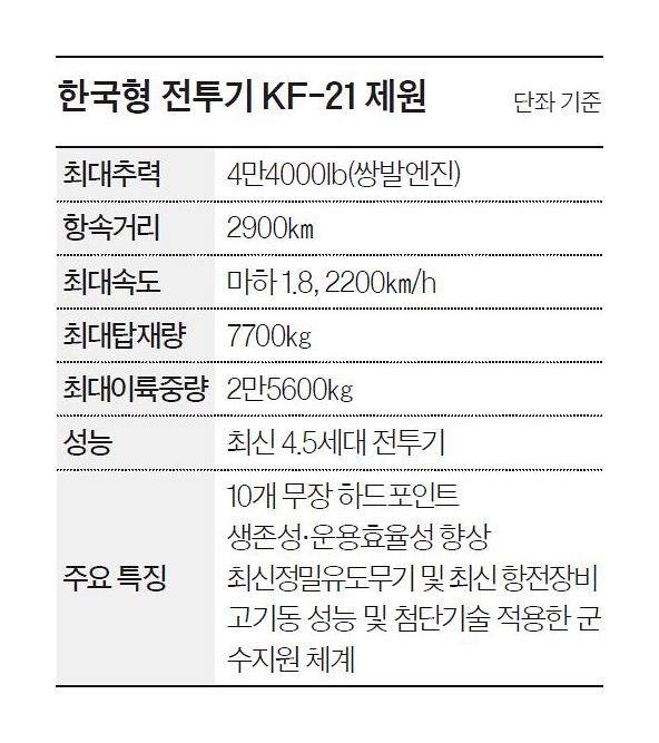 KF-21 보라매는 KAI가 공군, 국방과학연구소와 함께 한국형 전투기 사업을 통해 개발한 4.5세대 초음속 전투기다. 한국은 미국, 중국, 러시아, 일본, 프랑스, 스웨덴, 유럽 컨소시엄(영국·독일·이탈리아·스페인)에 이어 전 세계에서 4.5세대 이상 초음속 전투기 개발에 성공한 여덟 번째 국가가 됐다. KF-21은 최첨단 능동위상배열(AESA) 레이더를 탑재했고 최고 속도가 마하 1.8, 최대 항속거리는 약 2900㎞에 이른다.