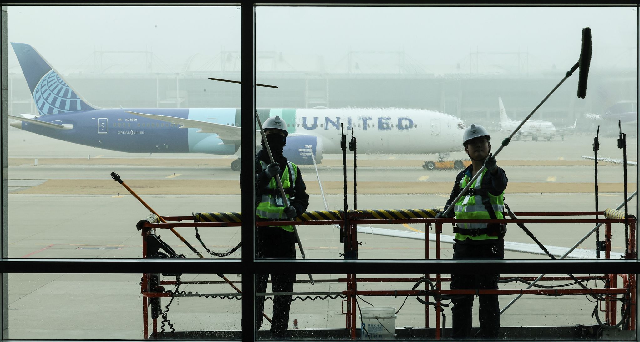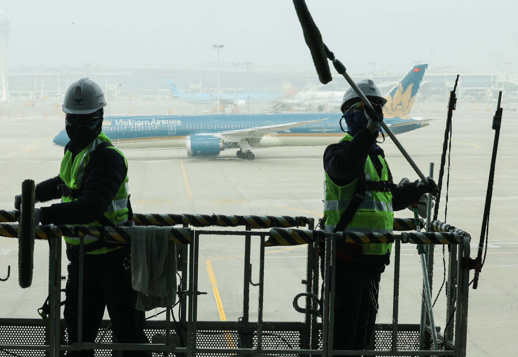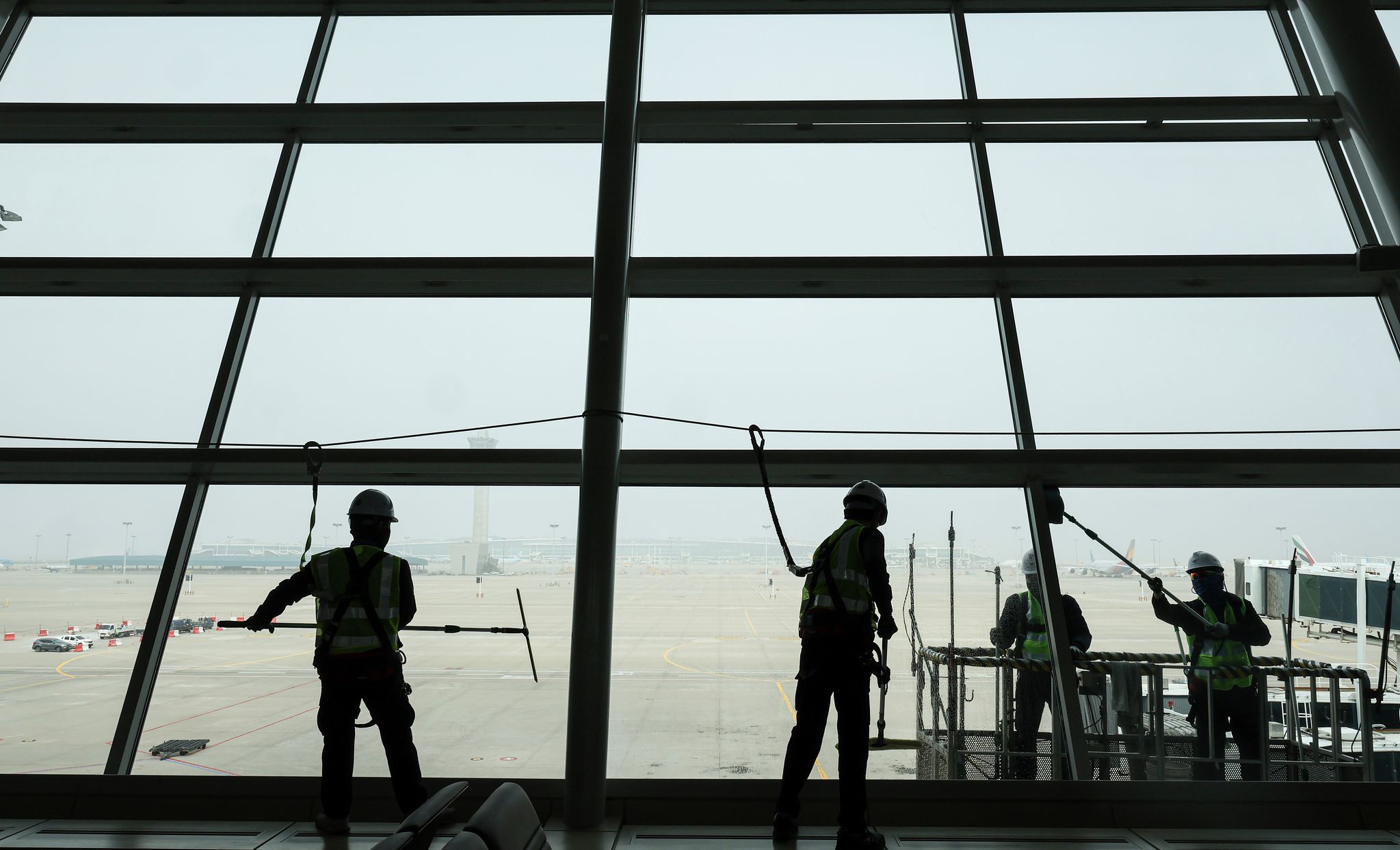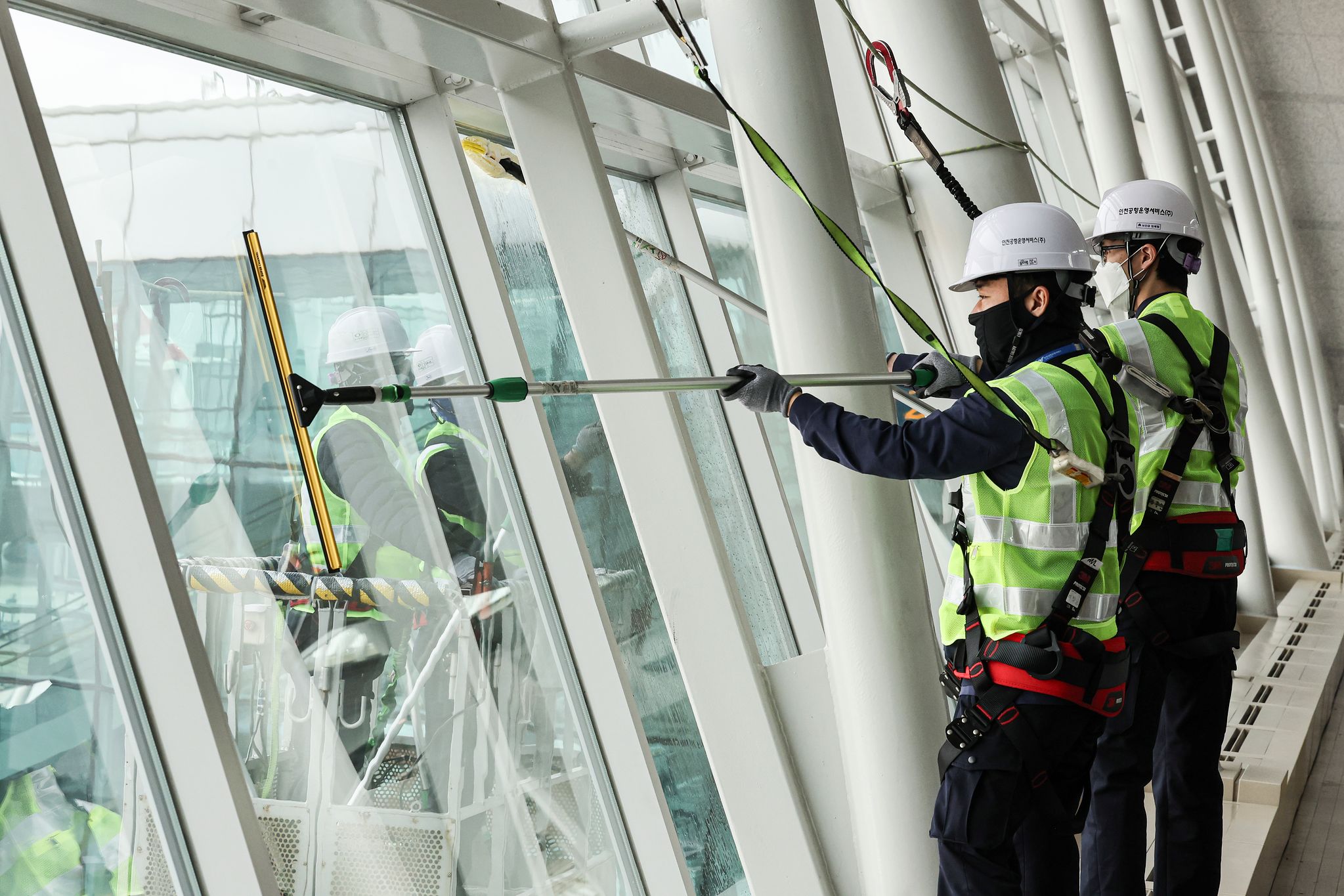 26일 오전 인천공항에서 작업자들이 유리창을 닦고 있다. 인천국제공항공사가 봄을 맞아 3월 3일부터 4월 10일까지 약 40일간 인천공항 제1·2터미널 및 접근도로 등 각종 기반 시설을 새롭게 정비 중이라고 이날 밝혔다. 이 정비는 겨울철 강설, 결빙으로 인한 공항 시설의 손상·오염 상태를 집중적으로 점검해 안전하고 쾌적한 공항 이용 환경을 조성하기 위한 작업이다. 매일 약 780명의 인력과 200여 대의 장비가 투입된다. 특히 공항 이용객들이 체감할 수 있는 휴게공간, 화장실, 안내시설 등 편의시설도 꼼꼼히 점검하고 청결 상태를 개선해 안전하고 쾌적한 이용 환경을 제공할 예정이다.