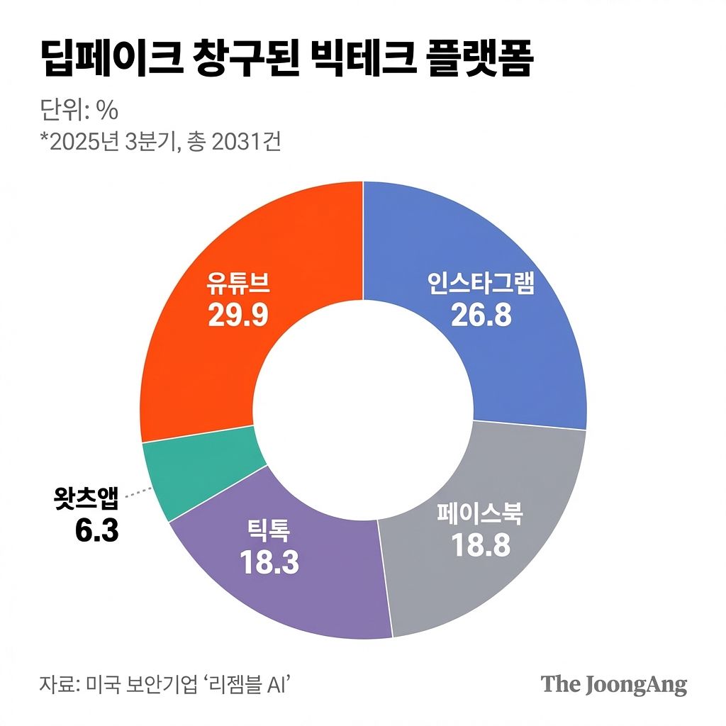 미국 보안기업 리젬블 AI에 따르면, 지난해 3분기 보고된 딥페이크 2031건 가운데 48.7%가 유명인 사칭 영상이었다. 플랫폼별로는 유튜브가 29.9%로 가장 높은 비중을 차지했다. 리젬블 AI는 “SNS가 딥페이크 확산의 매개체이자 조력자로 떠오르고 있다”며 “플랫폼은 딥페이크 콘텐트에 맞서겠다고 주장하면서도, 딥페이크 제작 도구 광고로 수익을 올리는 모순을 보이고 있다”고 지적했다.