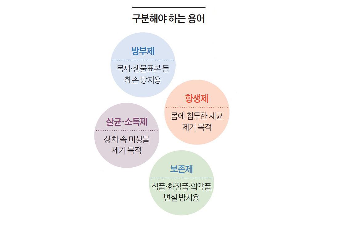 방부제, 독성 강해 피부접촉도 안 돼 그러나 오늘날에는 미생물을 제거하는 ‘살생(殺生)물질’을 이용하는 ‘화학적 보존기술’이 가장 널리 사용되고 있다. 화학적 보존에 사용하는 살생물질은 용도에 따라 다양하게 부른다. 목재의 내구성을 개선하거나 생물표본의 훼손을 막는 용도로 사용하는 포르말린·페놀·크레졸·황산구리 등은 ‘방부제’라고 부른다. 일반적으로 방부제는 인체 독성이 매우 강해서 사람이 먹을 수도 없고, 피부 접촉도 허용되지 않는다. 피부에 생긴 상처에서 미생물을 제거하는 용도로 사용되는 살생물질은 ‘살균제’ 또는 ‘소독제’라고 부르고, 우리 몸에 침투한 세균을 제거하는 목적으로 사용하는 살생물질은 ‘항생제’라고 한다. 수분이 포함된 가공식품·의약품·화장품은 물론 비누·샴푸와 같은 생활화학용품의 부패·변질을 막아주는 용도로 사용하는 살생물질은 ‘보존제(preservative)’라고 한다. 식약처의 ‘식품첨가물공전’에서는 그런 물질을 ‘보존료(保存料)’와 ‘산화방지제(antioxidant)’라고 부른다. 전통적으로 사용하던 설탕·소금·식초 이외에도 구연산(레몬산 또는 시트르산)·안식향산(벤조산)·소르브산·아스코브산(비타민 C)·토코페롤(비타민 E)·레시틴·이산화황처럼 낯선 이름의 물질도 보존제·산화방지제로 사용한다. 식물에서 채취한 천연 유기산·비타민·단백질도 있고, 정유사에서 생산한 나프타를 분해해서 얻은 성분을 화학적으로 가공해서 만든 합성 보존제도 있다.