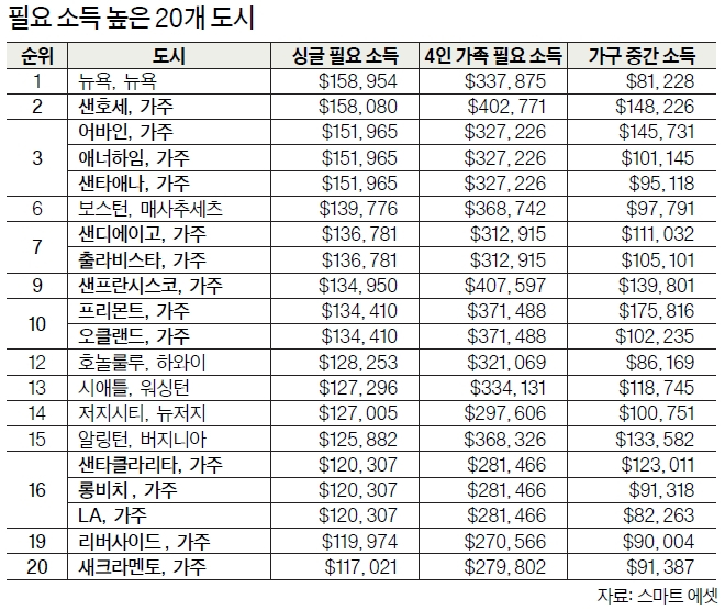 [전국 대도시 100곳 필요 소득] 톱 20에 가주 도시 14곳 포함 1위 뉴욕·2위 샌호세…주거비 탓 공동 3위 어바인은 32만7000불