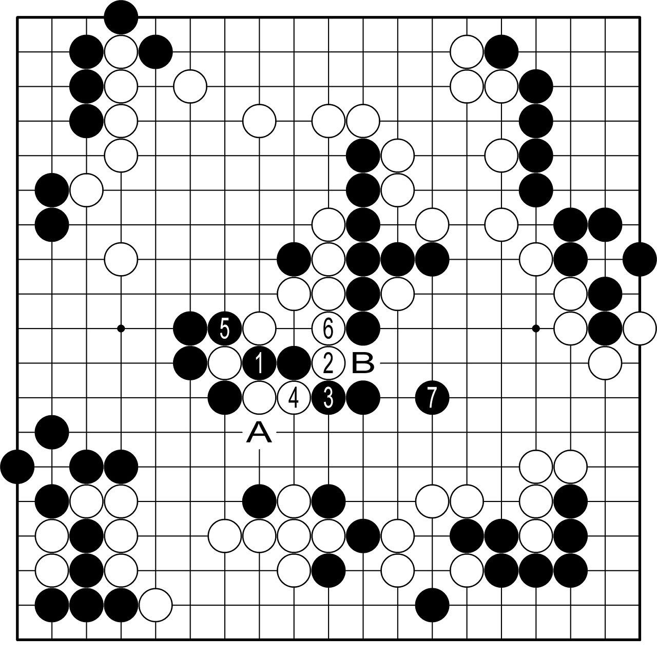◆실전 진행=먼저 실전을 본다. 흑1로 끊을 때 백2로 건너 붙이는 수가 백의 승부수다. 백4로 단수하면 흑5로 따낸다. 이렇게 빵때림을 주며 기어이 6으로 끊는다는 것이 시바노의 장렬한 옥쇄 전법이다. 흑7은 정수. A로 두 점을 잡으면 백B로 중앙이 끊어진다. 이제 백에게 마지막 한칼이 주어졌다. 최선의 공격은?