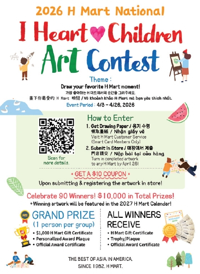 대회는 4월 3일(금)부터 4월 26일(일)까지 진행되며, H마트 스마트 리워드 카드 회원 자녀 중 Pre-K부터 5학년까지 참여할 수 있다.
