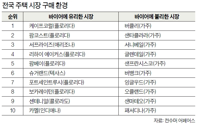 컨수머 어페어스는 주택 구매 환경을 평가하기 위해 주택 가격 대비 소득과 시장 경쟁도, 주택 규모, 거주 환경 등 주요 지표를 분석하고 시장 규모 비교를 통해 바이어에게 유리한 지역과 불리한 지역을 선정해 최근 발표했다.