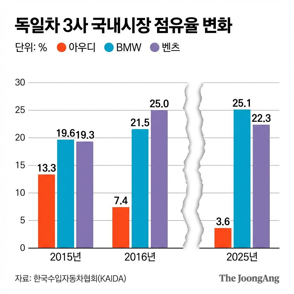 한국수입자동차협회(KAIDA)에 따르면 2015년만 해도 아우디는 국내 수입차 시장에서 13.3%의 점유율로 BMW(19.6%)·벤츠(19.3%)·폭스바겐(14.7%)의 뒤를 이었지만, 이듬해부터는 한자릿수대 점유율에서 벗어나지 못하고 있다. 지난해 BMW는 25.1%, 벤츠는 22.3%의 점유율을 보였지만 아우디는 3.6%에 불과했다.