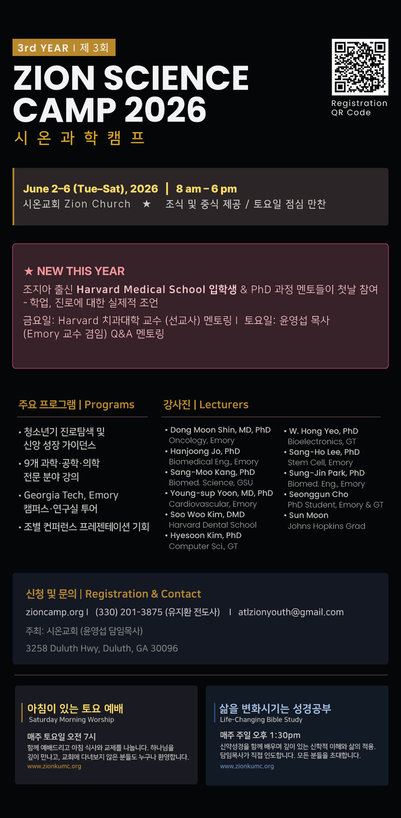 아틀란타 시온한인연합감리교회(담임목사 윤영섭)는 6월 2~6일 5일간 교회에서 과학캠프를 개최한다.신동문 에모리대 의대 교수, 조한중 에모리대 의생명공학과 교수, 강상무 조지아 주립대 면역학 교수, 김수우 하버드대 치대 교수 등 11명 강사진이 전문 분야 강의를 진행하며 조별 컨퍼런스, 대학 캠퍼스·연구실 투어 기회도 제공된다. 조식 및 중식 제공. ▶참가 신청 문의=유지환 전도사(330-201-3875), [email protected]