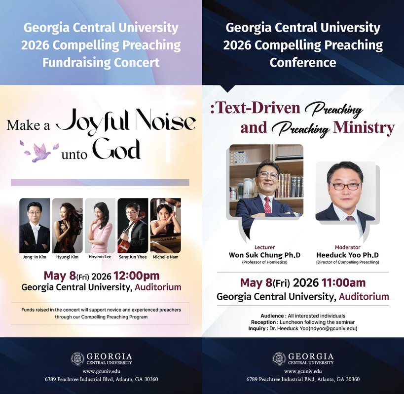 조지아센추럴대학교(GCU·총장 김창환)는 내달 8일 오후 11시부터 교내 강당에서 정원석 설교학 교수와 유희덕 설교 프로그램 디렉터와 함께 '성경에 기반한 설교법' 공개 강의를 연다. 강의 이후에는 설교자 육성을 위한 기금 마련 콘서트가 개최된다. ▶문의[email protected]