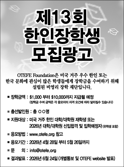 오테페(OTEFE)재단이 제13회 한인장학생을 모집한다. 미국 거주 한인 중 학부 및 대학원생(유학생 포함)과 2026년도 가을학기 입학예정자가 대상이다. 장학금은 1000달러에서 1만달러까지 자격 요건에 따라 차등 지급되며 선발인원은 최대 99명이다. 신청기간은 28일부터 내달 26일까지다. 홈페이지(www.otefe.org)에서 신청할 수 있다. ▶문의[email protected]