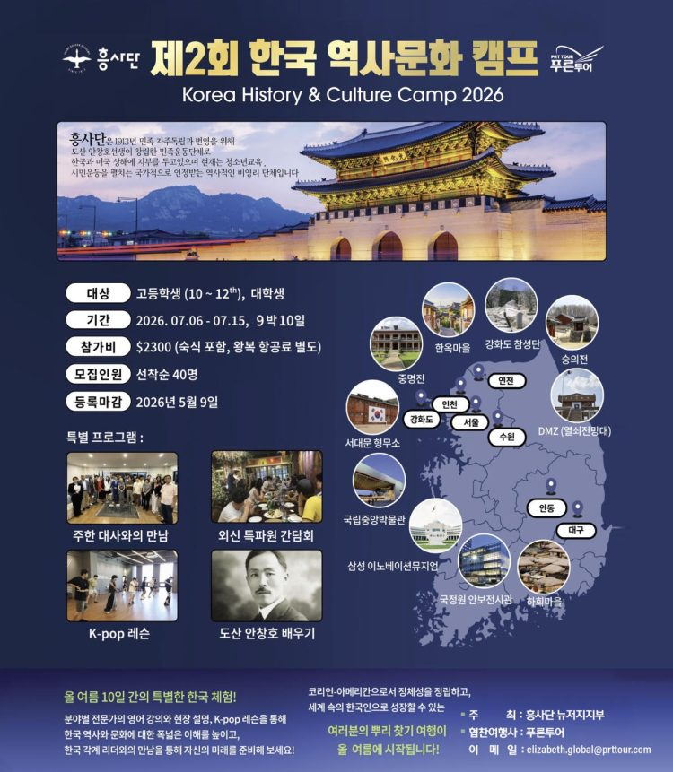 푸른투어(대표 문 조)가 흥사단과 함께 한인 2세 청소년을 위한 ‘한국 역사문화 캠프’를 개최한다. 7월 6일부터 15일까지 9박 10일 일정(한국 도착 기준)으로 한국의 주요 도시를 아우르는 교육형 프로그램이다. 종묘, 몽촌토성, 서대문형무소, 마니산 참성단, DMZ 열쇠전망대, 국립중앙박물관, 안동 하회마을 등 12곳을 탐방하며 주한 외국 대사, 주한 외신 특파원과의 만남, K팝 댄스 레슨 등 알찬 체험도 포함돼 있다. 참가비는 2300달러(항공료 별도)다. ▶문의=201-778-4000, [email protected]