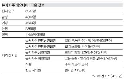 ◆주민 4명 중 1명은 한인=레오니아는 인구 8937명에, 총면적이 1.6스퀘어마일에 불과한 작은 타운이다. 인근에 한인들이 많이 사는 포트리 인구가 3만8000명, 팰팍이 2만1000명 정도인 것과 비교된다. 그러나 한인 인구 비율은 높은 편이다. 정확하게 집계된 공식 통계인 2010년 센서스에 따르면 한인 2361명이 살고 있다. 이는 전체 인구의 26.5%로, 4명 중 1명 이상이 한인인 셈이다. 중국계 주민은 236명(2.6%), 인도계 159명(1.8%), 필리핀계 135명(1.5%), 일본계는 126명(1.4%)이다.