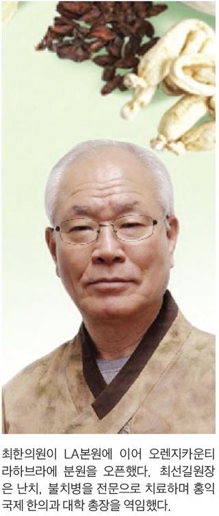 최한의원은 LA 지역의 올림픽 지점을 시작으로 30년 이상의 진료 경력을 가지고 있으며 난치, 불치병을 전문으로 치료하는 최선길 원장은 홍익 국제 한의과 대학을 운영하며 총장을 역임하기도 했다. LA본원에 이어 오렌지카운티 분원을 오픈하면서 이 지역의 많은 환자들을 진료하며 보다 나은 의술을 펼칠 계획이다.