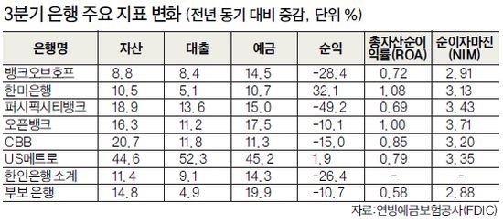 본지가 남가주에 본점을 둔 한인은행 6곳과 연방예금보험공사(FDIC)에 가입한 전국은행들(5033곳)의 3분기 주요 지표를 비교한 결과, 한인은행의 외형성장은 지난 분기에 이어 둔화세를 보였다. 그렇지만 수익성 지표인 총자산순이익률(ROA)과 순이자마진(NIM)은 FDIC 부보은행(전국은행)을 앞섰다. FDIC에 가입한 은행을 부보은행이라고 하며 그들은 예금보호제도 적용대상이다.