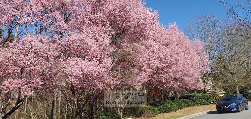 3월의 시작과 함께 도심 곳곳에 진분홍 벚꽃이 활짝 피어났다. 메트로 애틀랜타 지역 일대에 가장 먼저 봄꽃 소식을 알린 이 벚꽃은 일본 이즈반도가 원산지인 가와즈 벚꽃으로 한국 여의도나 진해 등지에서 볼 수 있는 왕벚꽃보다 훨씬 일찍 꽃망울을 터뜨린다. 사진은 지난 4일 눈부신 진분홍 벚꽃으로 장관을 이루고 있는 둘루스 플레전트힐 로드 옆의 한 아파트 단지 입구 모습이다.