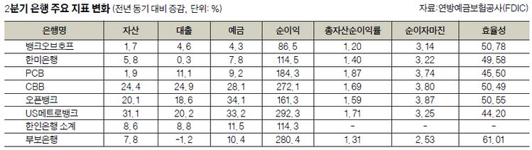 수치가 높을수록 수익성이 우수하다는 걸 의미한다. 평균보다 소폭 낮은 뱅크오브호프를 제외하고 한미은행, PCB, CBB, 오픈뱅크, US메트로뱅크는 최소 0.09%포인트에서 최대 0.56%포인트 더 높았다.