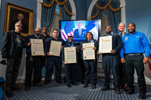 지난 12일 브루클린 선셋파크에서 발생한 총격사건 당시 승객들을 대피시킨 메트로폴리탄교통공사(MTA) 직원들이 15일 뉴욕시청에서 공로패를 받았다. 코로나19 확진 후 격리중인 에릭 아담스(가운데 화면) 뉴욕시장은 가상으로 참석, "현장에 있던 영웅들에게 감사의 인사를 전하고 싶다"고 말했다. [뉴욕시장실]브루클린 총격 뉴욕시장실 에릭아담스